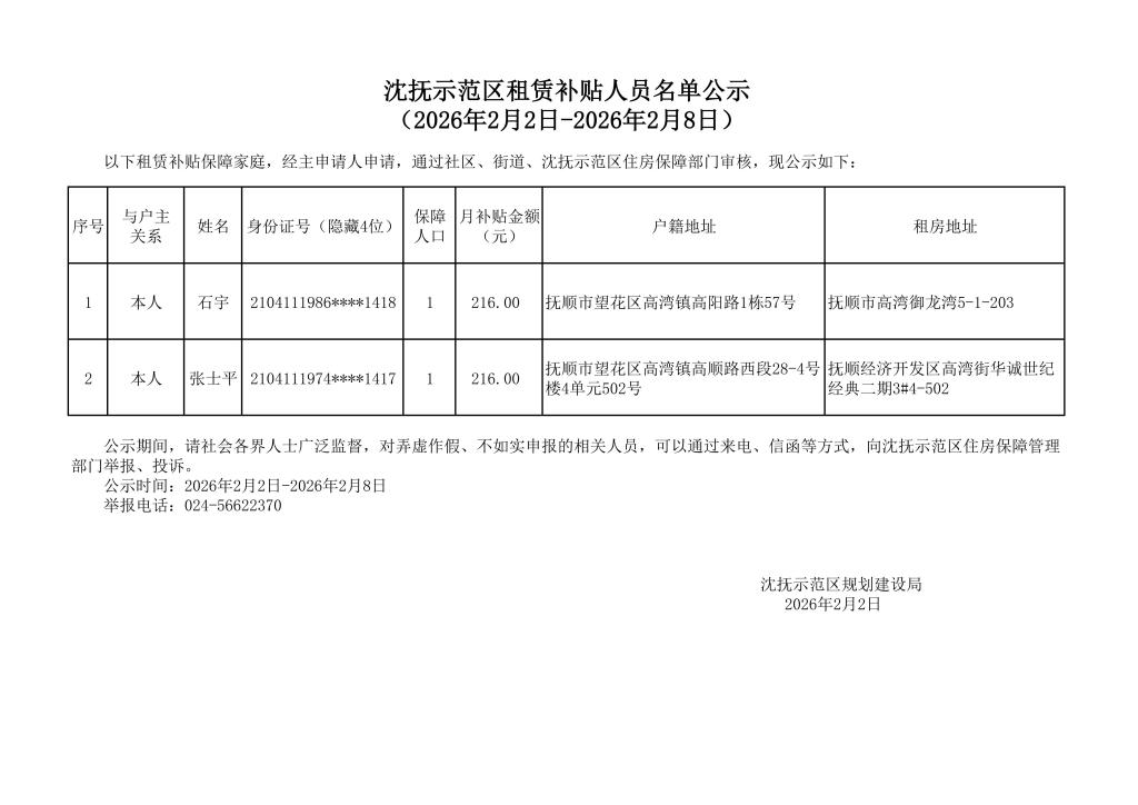 沈抚示范区租赁补贴人员名单公示