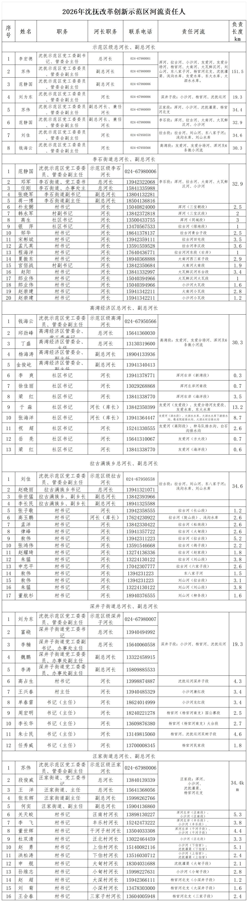 2026年沈抚改革创新示范区河流责任人