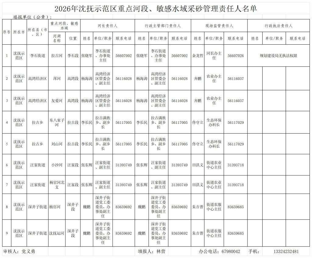 2026年沈抚示范区重点河段、敏感水域采砂管理责任人名单